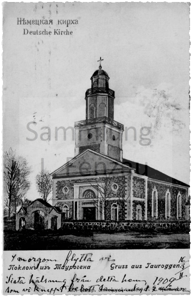 Während des 1. Weltkrieges war Tauroggen ab 1914 von den Deutschen besetzt, die die Stadt plünderten und zerstörten. Im Jahr 1915 wurde der Turm der evangelisch lutherischen Kirche in Tauroggen von der deutschen Armee zerstört. Der damalige Turm war kleiner ausgeführt als der neue Turm, der 1938 eingeweiht werden konnte.