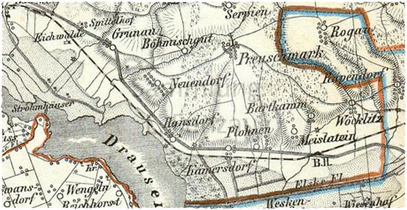 geht es nach Preussisch Mark (Przezmark), Grunau (Gronowo Gorne) und Hansdorf (Janov). [6]