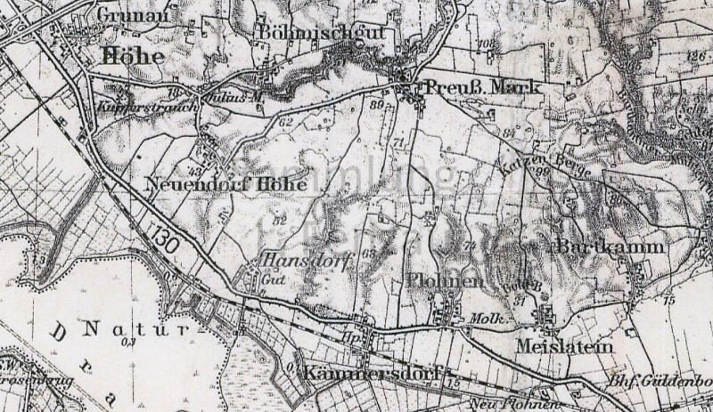 Um 1830 wurde die Preussisch Holländer Chaussee durch die benachbarte Gemarkung geführt, 1852 die Ostbahn. Von 1903 – 1909 wurde über die Neuendorfhöhe führende Chaussee Grunau-Wolfsdorf gebaut.